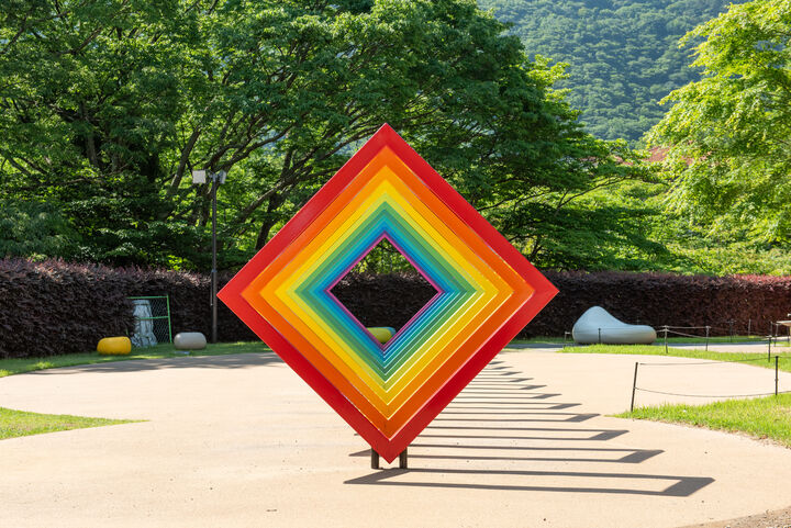 Shigeo Matsubara said, "Placing objects in parallel rows links the space, fusing it with the outdoor nature and giving birth to an orderly cosmos." In this work, a series of square objects, all exactly the same size, have been placed in a row and colored red, yellow, green, and blue, following the colors of the rainbow. The 12 colors create a rhythm and harmony, producing a microcosm of color in which it seems we can almost hear sound. This work, is an environmental sculpture, bringing peace to people's minds while surpassing even the form conceived by the artist to assume also the function of play.