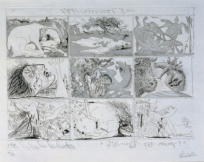 1936 年,反對共和國政府的法西斯起義開始,西班牙進入了長達三年的內戰。畢卡索在巴黎萬國博覽會上製作了兩幅蝕刻畫《佛朗哥的夢想與謊言》以及一首親筆詩作,目的是為自己國家的共和國政府提供財政支持。