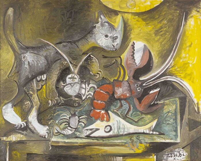 畢卡索也被貓的「女人」柔軟而野性的形象所吸引,從這段插曲可以看出:「有一天,畢卡索開始製作一個女人的石膏像,但他完成的卻是一隻貓」。他還告訴他的朋友兼攝影師 Brassaï [1899-1984]:「我不必要地喜歡貓兒,不是在沙龍沙發上縱容自己的豪華貓兒,而是回到野外毛髮拂起的貓兒」。這幅作品讓人想起 18 世紀著名靜物畫家 Jean-Baptiste-Siméon Chardin [1699-1779] 的畫作《紅蕾絲》(1725-26,巴黎羅浮宮),但與 Chardin 寫實的小貓相比,畢加索的貓被渲染得很粗糙、野性,它的力量壓倒了周圍的環境。另一方面,桌上的龍蝦在表情和形態上都充滿幽默感,它即將受到攻擊,長長的觸角讓畫面充滿衝擊力。