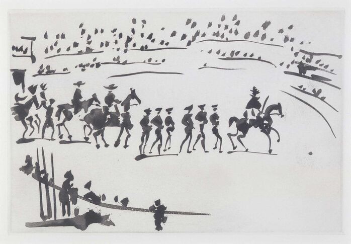 此作品是 José Delgado (Pepe Irijo) [1754-1801] 所著的《The Art of Bullfighting》(1796)的版本,其中有 26 幅畢加索的插圖。畢卡索私下將它交給大衛-道格拉斯-鄧肯 (David Douglas Duncan),後來被森美術館收藏。畢卡索八歲時畫了他的第一幅油畫,畫中描繪的是他父親經常帶他去看的鬥牛。鬥牛是畢加索生活中最大的樂趣之一,也是他生命中不可或缺的一部分。它既是神聖的儀式,也是狂熱的戲劇。這部電影是在 1957 年春天,看完鬥牛後的下午,坐在桌邊不到三小時內完成的。
