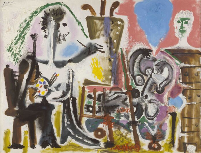 畫家與模特兒」是畢卡索晚年經常出現的主題之一。醜陋的年老畫家只能茫然地凝望著年輕美麗的模特兒。