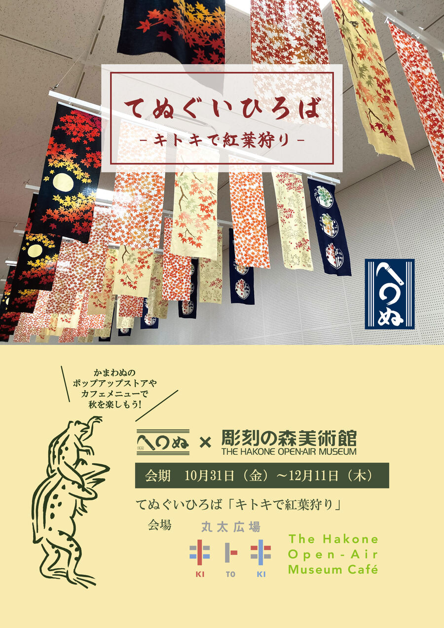 手ぬぐい専門店「代官山かまわぬ」の紅葉にちなんだてぬぐいおよそ200枚を丸太広場キトキ全体に吊るし華やかに紅葉を演出。