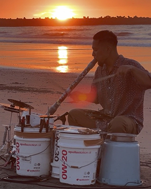 バケツや廃材などの身近な物でドラムセットを組み上げ、水道管に使われる塩ビパイプをディジュリドゥにして音を奏でるアーティスト。