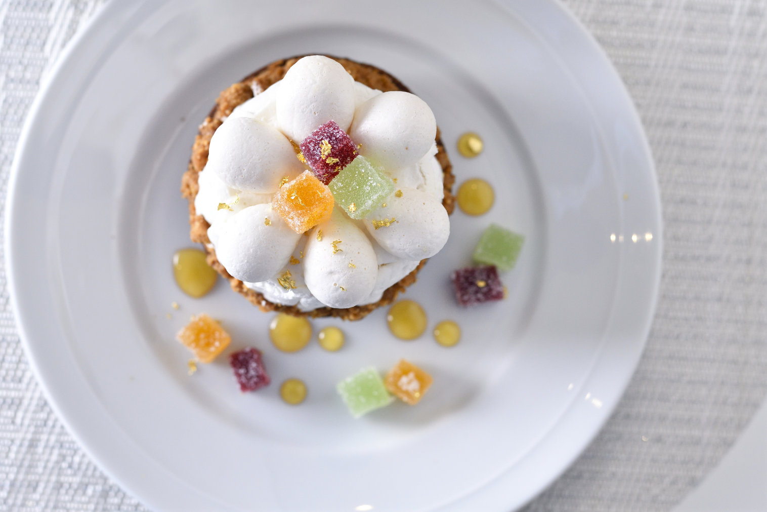 純白のウエディングドレスを思わせるタルトのトップを彩るのは、誕生石カラーのパート・ド・フリュイ。仕上げには広島・歴清社の高純度金箔をひとふり。こだわりの素材が織りなすハーモニーに、春のきらめきを感じる一品です。