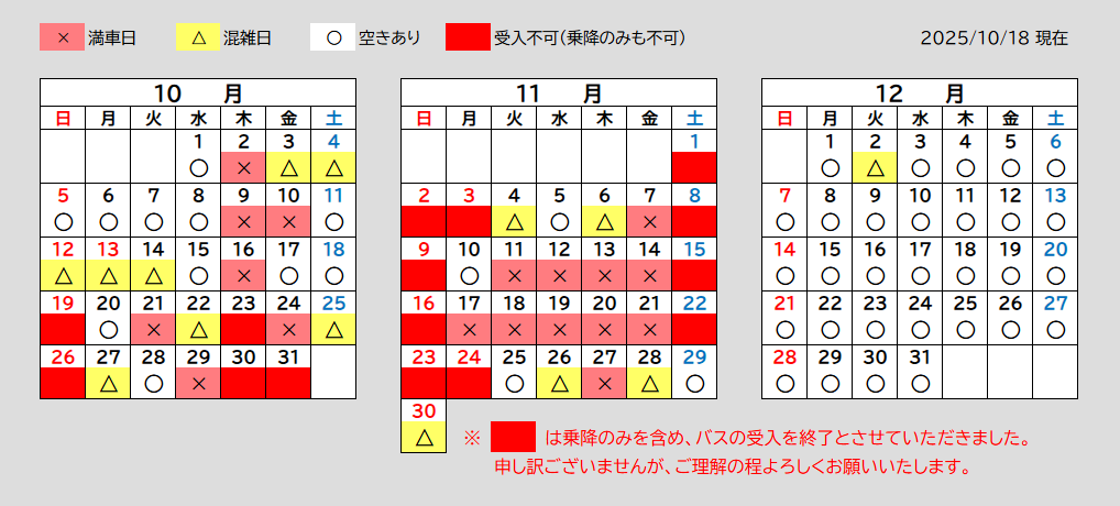 尚、赤枠で表示されている日にちについては、乗降のみの場合も含めバスの受入を終了させていただきました。