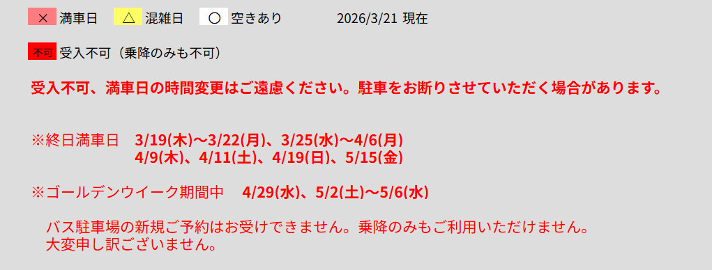 旅行会社、バス会社さまへ バス駐車場満車日のお知らせ