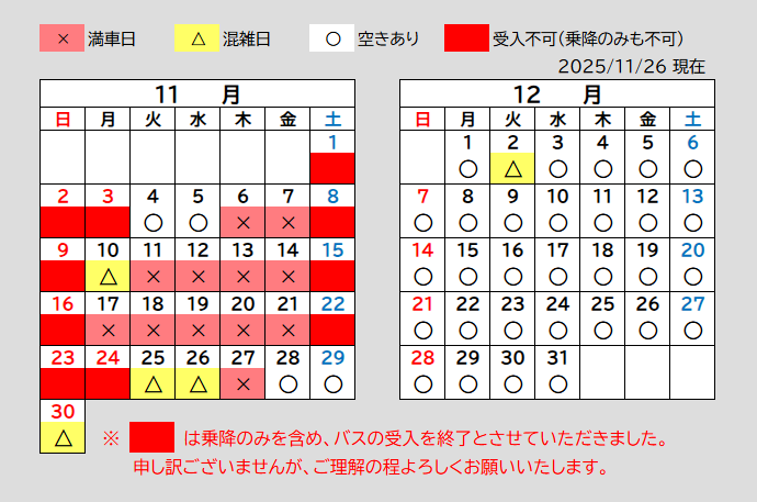 尚、赤枠で表示されている日にちについては、乗降のみの場合も含めバスの受入を終了させていただきました。