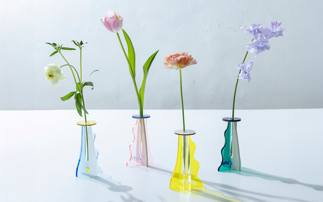 木とアクリルのパーツを組み立ててできる一輪挿し。